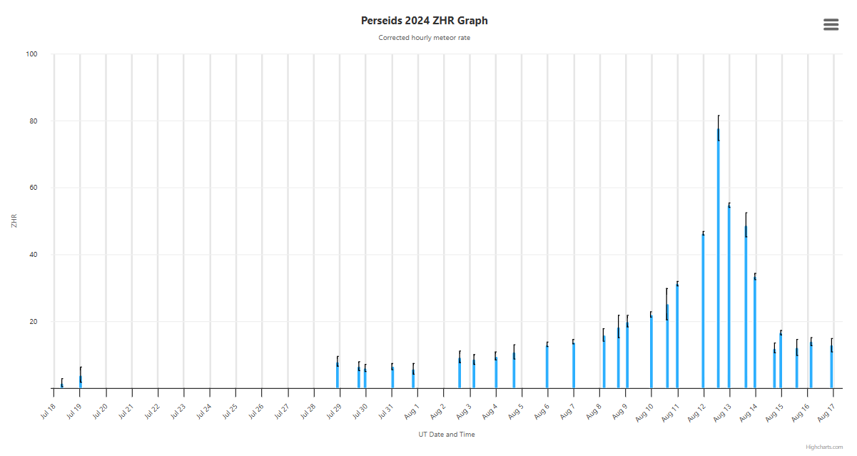 โฒ 2024 ZHR Perseids meteor chart which shows the number of meteors an observer would see under a very dark sky in July and August (by IMO)