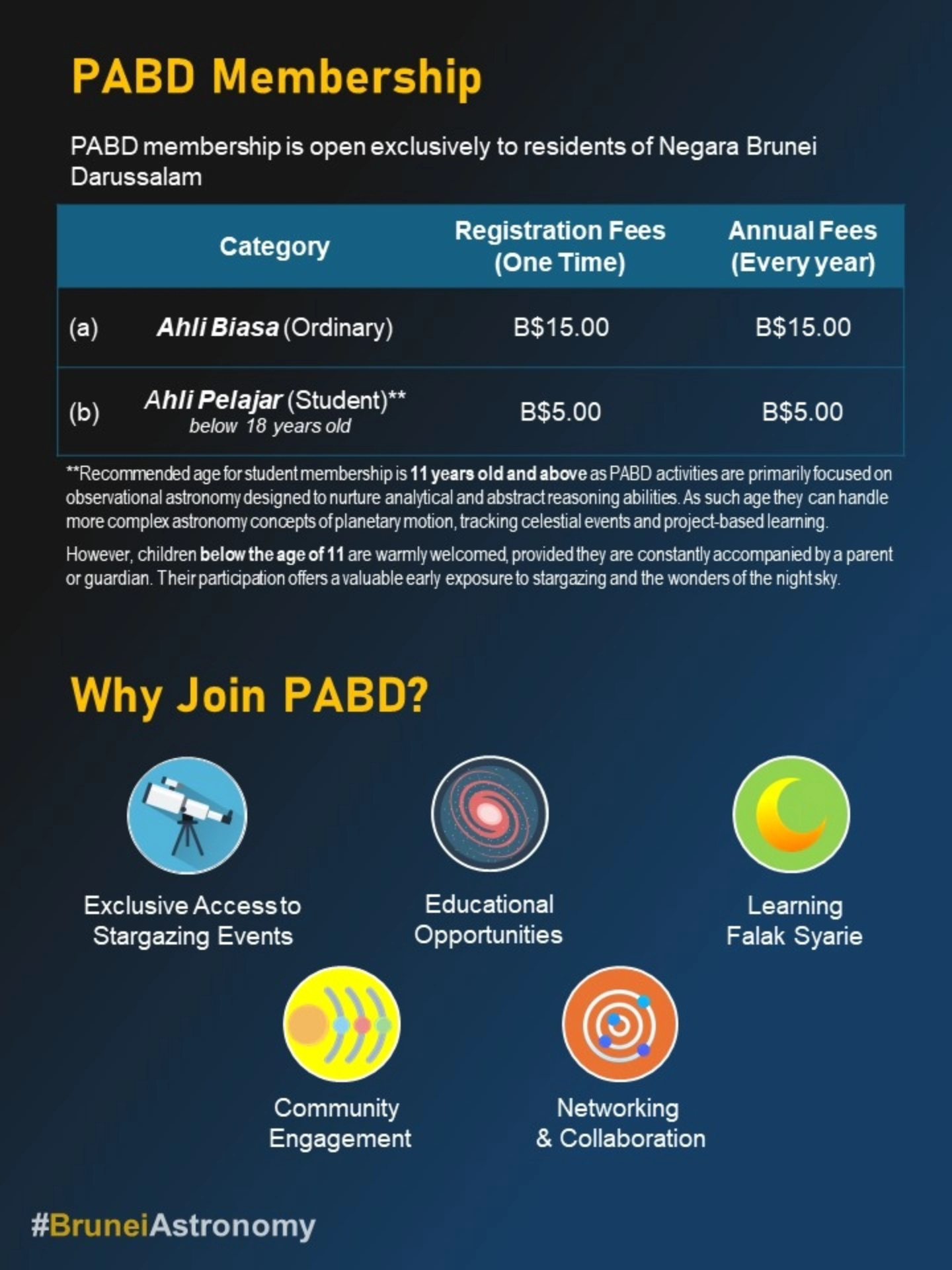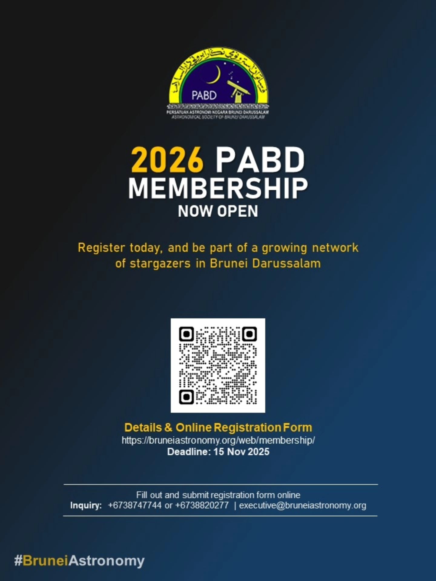 Registration is now available online via https://bruneiastronomy.org/web/membership, with the deadline for Batch 1 set for 15 November 2025. Upon submission, applicants will receive an official acknowledgement from the PABD Executive, followed by a structured orientation programme.