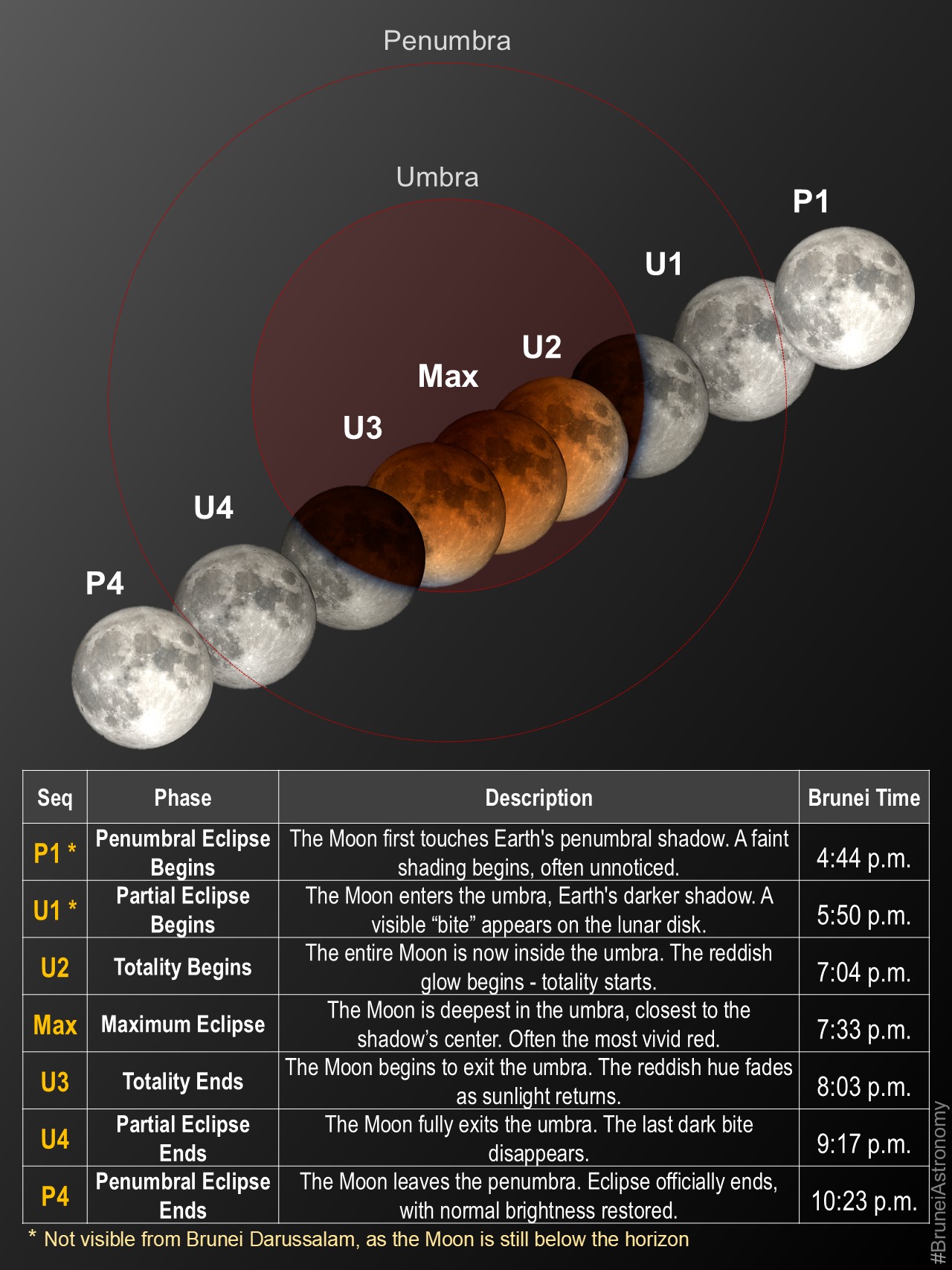 The early stages of the eclipse occur while the Moon is still below the horizon in Brunei. The initial penumbral and partial phases will therefore not be visible locally. The eclipse becomes observable once the Moon rises already in partial eclipse, leading into the full phase of totality.