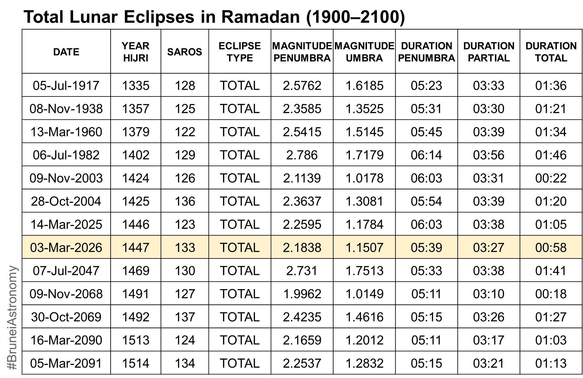 This rare celestial event is especially significant as it falls in Ramadan. It is the last total lunar eclipse before the next one occurring on 31 December 2028 โ 1 January 2029, which is visible from Brunei. For a total lunar eclipse that again coincides with Ramadan, the wait will be much longer: the next one that falls in Ramadan will occur on 7 July 2047 – 21 years from now.