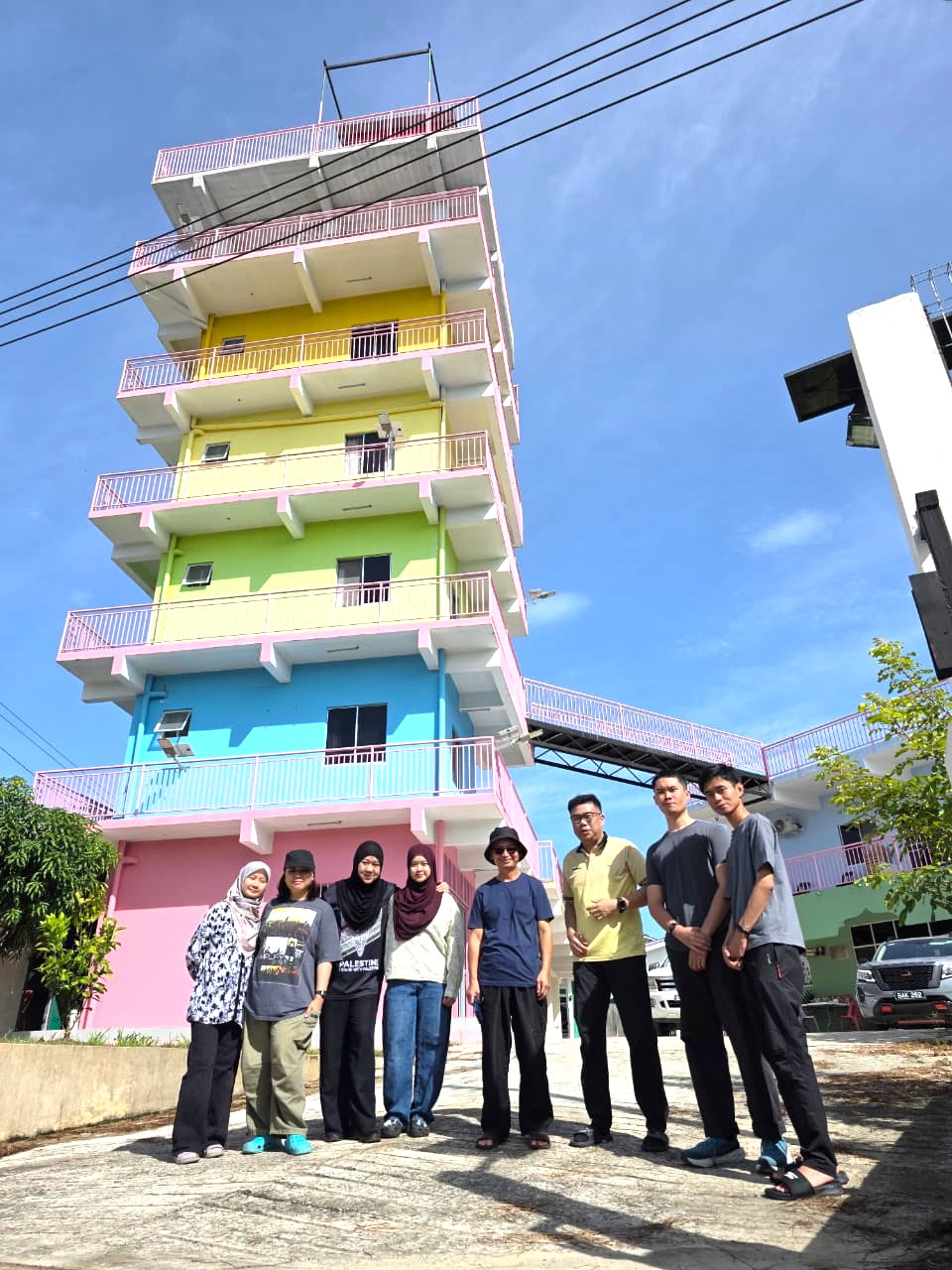 Our first stop was the Kompleks Balai Cerap Saizwagger 2 in Papar, an observatory operated by Dr. Hj. Sairin, an astrofalak expert. The building itself reflected a strong astronomy theme, with planetary designs throughout the interior. Even the small details, such as bedsheets and floor tiles designed with compass directions, created a space that felt intentionally connected to celestial observation. From the sixth floor, the landscape stretched across distant mountains and hazy horizons, illustrating how observatories are often located in elevated areas to minimise atmospheric obstruction and artificial light.